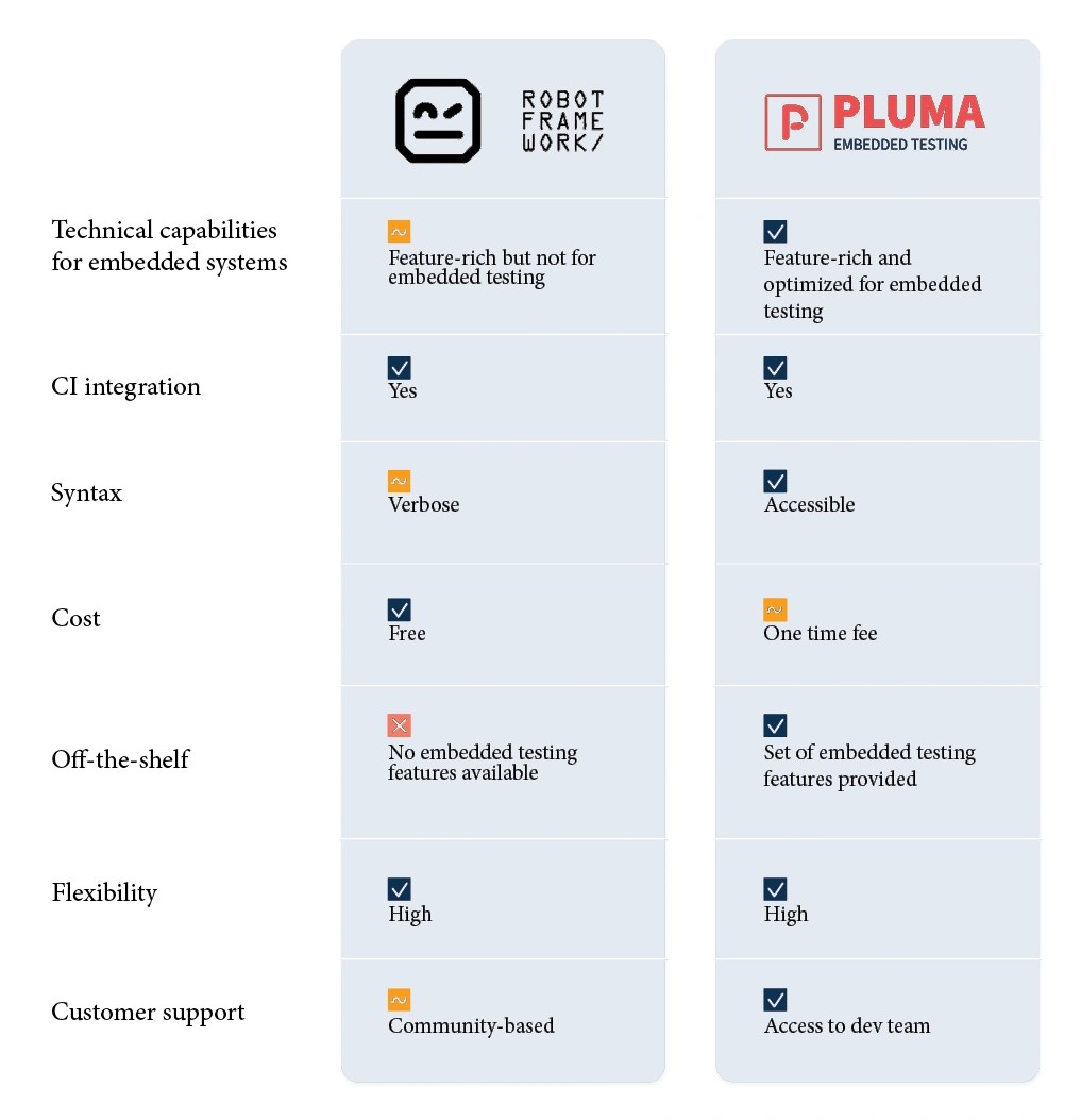 While Robot Framework is rich in features for general testing, it is not optimized for embedded testing. Its verbose syntax can pose challenges for project management and less technical teams. For embedded systems, Pluma automated testing tool offers a robust and efficient alternative, designed to meet the specific needs of device manufacturers.